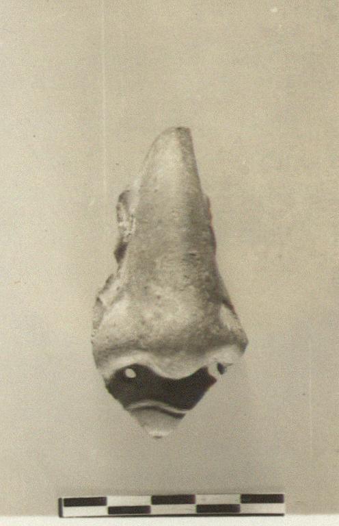 | Description: | Nose from a tragic mask. Traces of white paint. Coarse dark purplish-pink clay. Cf. T 1818. | |
