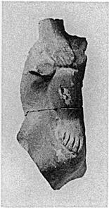 | Description: | Right hand and arm, and right leg. Chubby hand resting on a fat short leg, at the knee; the arm and leg are in relief against an irregularly shaped background. Traces of red paint. Hollow. Pink clay. From a plastic lamp. Compte Rendu, pp. 206 ff., pl. VI, no. 6. | |