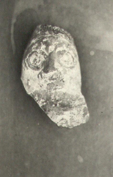 | Description: | Upper part of front of a man. Top of head broken away. Part of beard (?) preserved below gaping mouth. Large staring eyes. Mould-made, hollow. Red, yellow and black over white paint, well preserved. Coarse red clay. | |