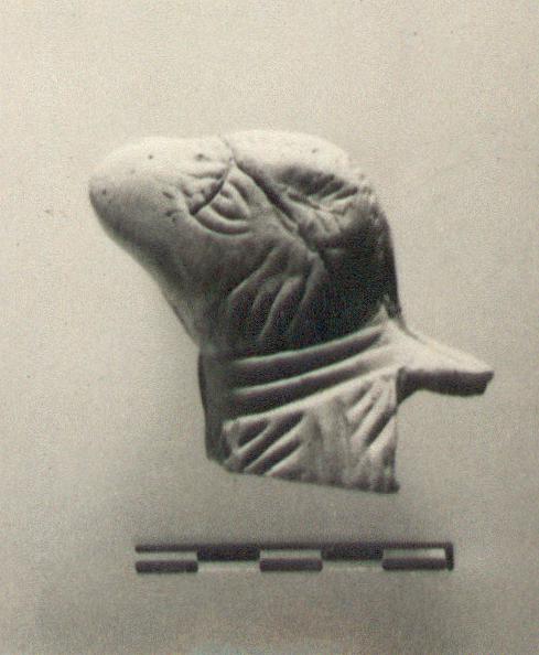 | Description: | Head of dog only preserved. Gouged style. No trace of added color. Clay orange-red inside; orange-buff outside. Cf. T 1422. | |