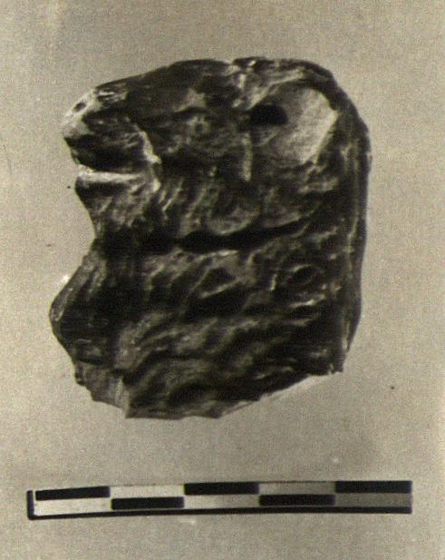 | Description: | Perhaps from a plastic pot. Broken off at neck. Bridle and reins added in white over red (or vice versa ?). Soft buff clay covered with dull black glaze. | |