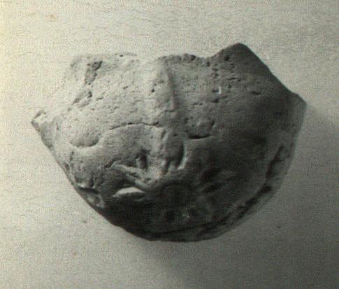 | Description: | The top of what looks to have been a mask-like object, with a suspension hole at top. Preserved is only a projecting dome, with a sunflower-rosette in relief in center, on a thick stalk. Unglazed. Orange clay. | |