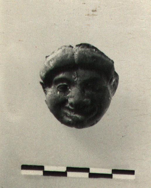 | Description: | Head in relief; grinning mouth and projecting tongue. The back plain and slightly concave, looking as if it had been affixed to something. Apparently complete. Faint traces of white. Gray clay. | |