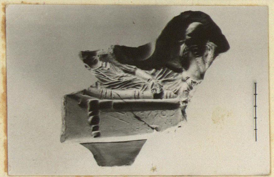 | Description: | Part of lower edge preserved, with one leg of a low table or couch. On a sort of a panel hanging from or just under the table and outlined in low relief in the mould, letters, also in low relief. Second fragment, joining, found. Full height of mold preserved; broken at left, and at lower right. Represented is a group of two figures, a woman on a couch, and a male figure wearing a comic mask seated on the couch at her feet (to the left in the positive). The woman holds a wreath in her right hand. The man in his left. In relief in the mold is the inscription: COMEDIA PYLADES written on the background beneath the couch. <graphic> | |