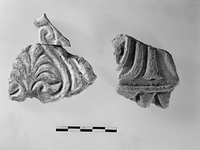 | Description: | Fragment from a thin flat circular plaque; preserved is the upper part of a lotus flower ornament in low relief, within a raised band. Above (around) the band, a series of triangular projections. Apparently broken all around; one of the tips at the top perhaps original. Unglazed. Light brownish-pink clay, somewhat micaceous. | |