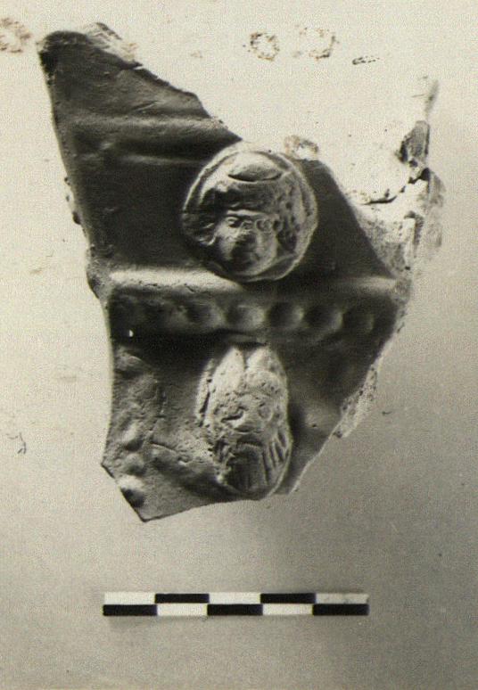 | Description: | Several joining fragments preserve much of the upper part, and part of the flaring base on one side; nothing of the lower edge. Rectangular object, the walls flaring to a plain rim flat on top. Highest at the corners, the wall between cut down. At junction of upper and lower parts, a raised band with a row of ovules, moulded. Applied on each face, above, a head, frontal, with abundat hair; wreathed (?). Below, on the one preserved face, a horned satyr's head, superimposed on a garland. Faint traces of white. Pinkish-buff clay; the interior very rough. | |