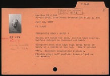 | Description: | Elongated head with high bald brow; trace of hair, or a wreath at the top. Small pointed ears, somewhat exaggerated features. Broken off below the chin, and the back missing. Surface chipped on forehead and head. Satyr (?). Traces of red on the wreath. Pinkish clay; buff surface. ADDENDA Same mold as T 824 | |