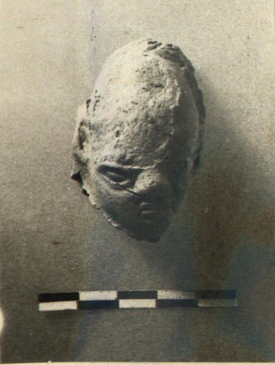 | Description: | Elongated head with high bald brow; trace of hair, or a wreath at the top. Small pointed ears, somewhat exaggerated features. Broken off below the chin, and the back missing. Surface chipped on forehead and head. Satyr (?). Traces of red on the wreath. Pinkish clay; buff surface. ADDENDA Same mold as T 824 | |