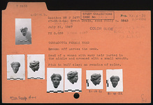 | Description: | Head with wavy hair parted in the middle and crowned with a small wreath. Broken off across the neck. No remains of color. Pink to buff clay. | |