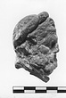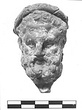 | Description: | Bearded head with heavy moustache and curling hair crowned by a drapery roll (rolled fillet). Broken off at neck. Hair worked behind. Traces of white, with red on face and hair and fillet. Light buff clay. ADDENDA Other uncatalogued fragments; cf. fragments in group drawer NN-Box 821. | |