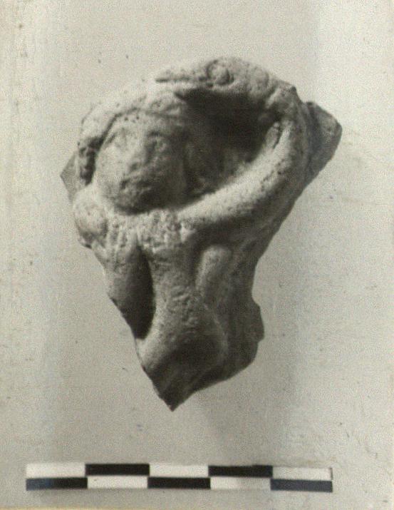 | Description: | In rather high relief, the head, facing, and the arms of a person defending himself from a snake which has wound itself about the person's body and neck. His hands are raised to his neck to pull the snake's coil away. Broken all around; the upper side slightly concave. Buff clay, pink at core. ADDENDA C. G.: Animals on plaque, cf T 552, T 960. | |