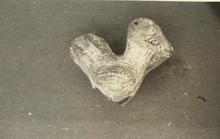 | Description: | Cock figurine with head turned slightly left. Feet (?) broken away. Broad, crudely joined; feathers rendered by herringbone incision. Mould-made. Painted in red stripes outlined with black and with traces of yellow, on a white ground. Dark pink clay. | |