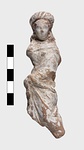| Description: | Small head, with curling locks surmounted by a heavy rolled wreath. Two joining fragments give the figurine nearly complete, the body and arms closely wrapped in a thin himation. Broken below chin. Firm white, and traces of red. Buff clay. ADDENDA Cf. T 2602. Cf. Dimitrakopoulou (2024), no. A12, p. 147, fig. 2. | |