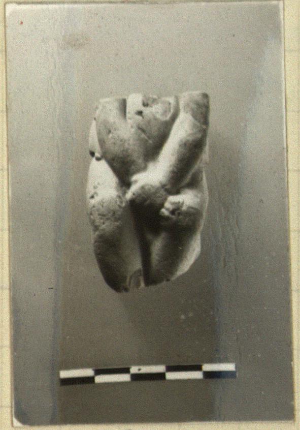 | Description: | Fat nude figure seated, with hands crossed on left knee; head, shoulders and feet missing. Broken top and bottom; part of original edge preserved at back. Gritty blond clay with light buff surface and a few traces of white. | |