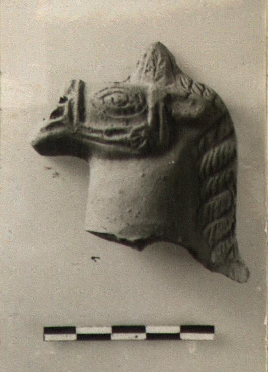 | Description: | One half of head, broken at neck and mouth; finished edges behind show that other half was made in separate mould. Braided mane and top knot. Bridle with rosette at corner below eye. No trace of paint. Micaceous buff clay. | |