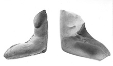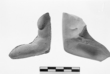 | Description: | Mold for half of male seated figure, perhaps doll. Buff soft clay. | |