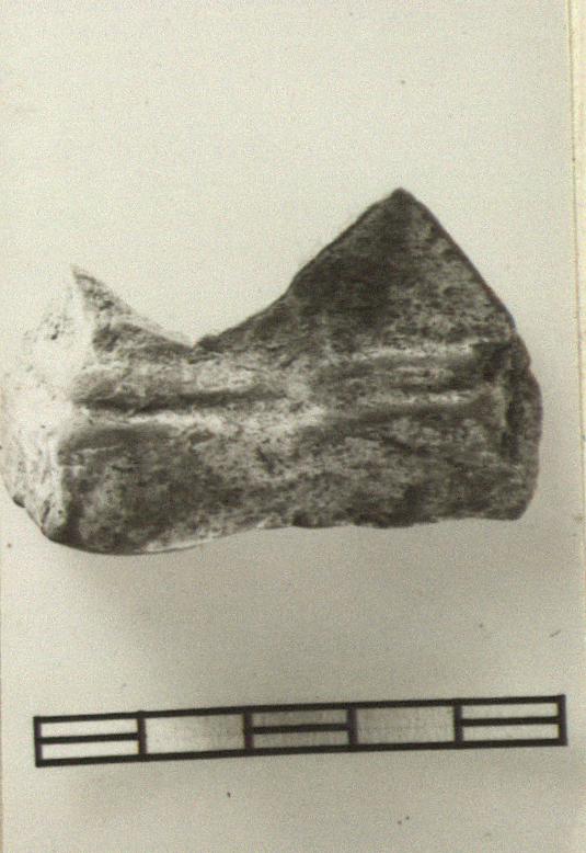 | Description: | Shallow moulding. Top broken. Yellow on upper part, red in groove, plenty of white. Soft reddish clay. | |