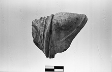 | Description: | Fragment probably from the left breast of seated draped figure, on a large scale. Possibly from T 2633 (ΔΔ 476)? Buff clay; with white. | |