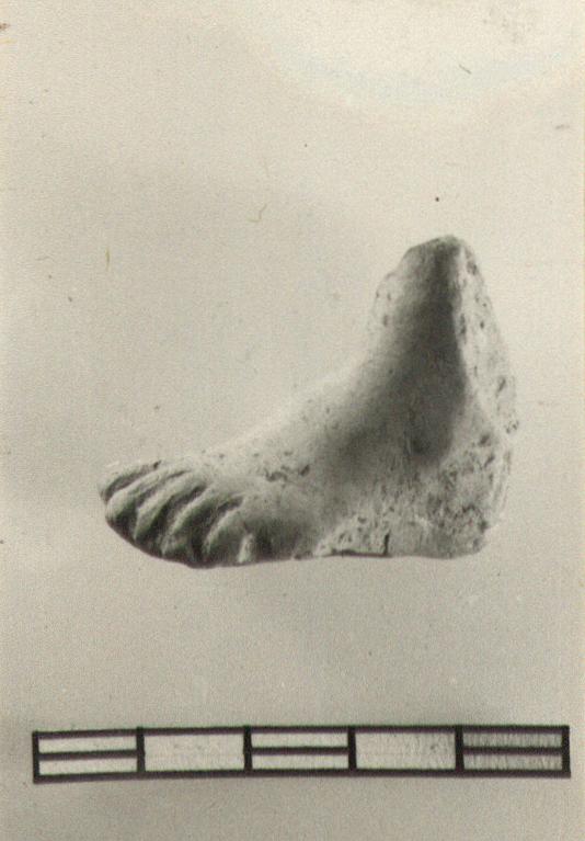 | Description: | Fragment a), part of foot; broken above ankle. Fragment b), arm with hand. Solid; resting surface. Pale buff clay. | |