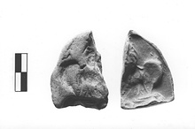 | Description: | Fragment from small seated draped woman holding a tympanum (?). Preserved at left of positive. Back indented; much worn. Soft buff clay. | |