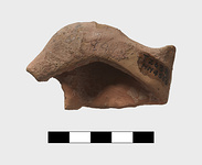 | Description: | Preserved from neck to waist. Right hand lifts drapery; left broken at elbow. The figure wears a light cord from the right shoulder between the breasts. Buff clay, much eaten, covered with a deposit over hard white slip. | |
