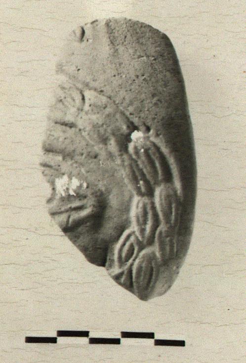 | Description: | Preserved the upper left quarter of the face, with wreath and headdress. Double wreath of pointed leaves frames face, and above it is set a high headdress, apparently decorated with leaves at front. Mould-made in low coarse relief; iris pierced. Traces of white. Coarse red clay, micaceous, unglazed. | |