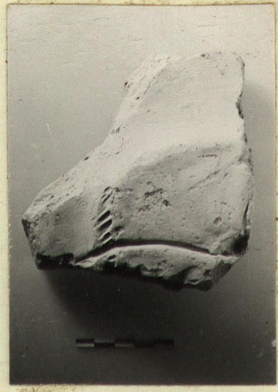 | Description: | Uncertain subject. Heavy fabric, reddish-brown at back, light cream on surface. Flat back; broken all around. Architectural (?). | |