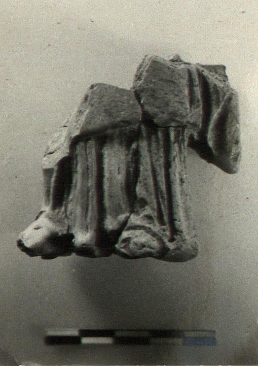 | Description: | Lower part of standing draped female figure, about to knees. The feet project below the chiton; the edge of the himation is preserved above, with a heavy fold hanging at the left side. Pinkish-buff clay. | |