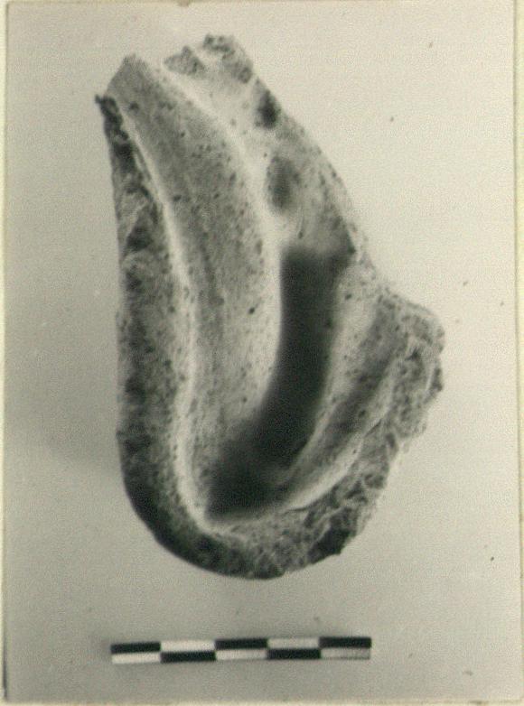 | Description: | Irregularly shaped, thick, with flat bottom; mold for the curving end of some object. One edge preserved, otherwise broken. Coarse buff clay with brick red particles; light buff slip. | |