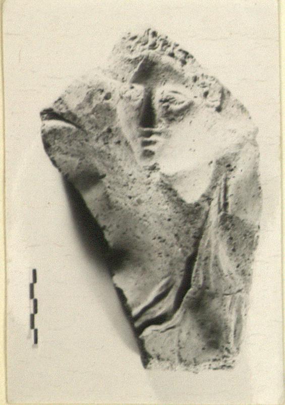 | Description: | Preserved is a wounded or fighting Amazon. Part of a large face, full front can be made out, and drapery below. Broken all around. | |