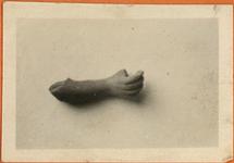| Description: | Right forearm, elbow and hand. Thumb missing. Fingers partially closed to hold object. Faint trace of red paint over white. Mold made; crude work; solid. Pinkish buff clay. | |