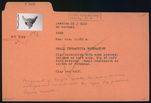 | Description: | Fragment of tragic mask. The end of the nose with pierced nostrils and the upper lip preserved. Gaping mouth. Red-buff clay. | |