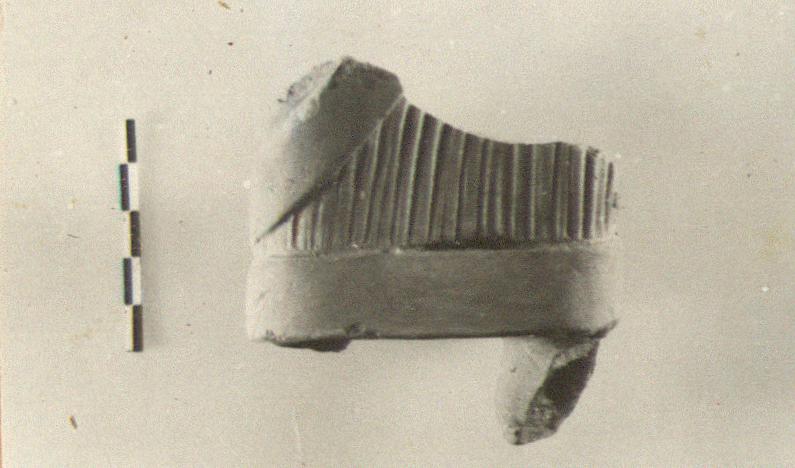 | Description: | Lower part of standing draped figure wearing cloak over finely pleated drapery (?). Wide horizontal band at bottom of skirt; feet (mostly broken off) attached below. Original bottom of one foot preserved. Reddish-buff clay, light brown at surface. ADDENDA Pottery stored in T 198. | |