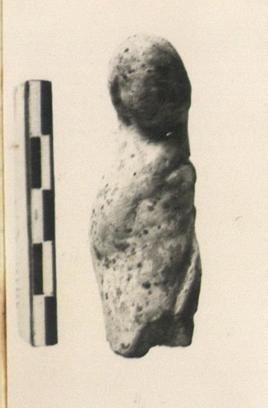 | Description: | The figure wears a himation, tightly wrapped and drawn up over the head. Right hand holds garment at neck. Back plain. Very worn mould; features almost indistinguishable. Traces of color (?). Dirty light buff clay. | |