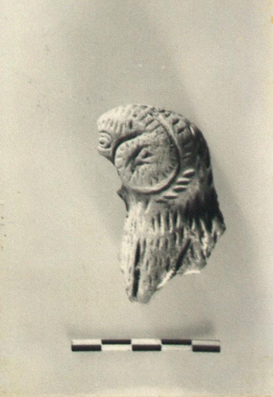 | Description: | Back of head and part of shoulder preserved. The eye, the horn, and the fleece are gouged in. Broken at bottom and along joint between two halves of mould. Muzzle missing. Traces of red and white paint. Pinkish-buff clay. | |