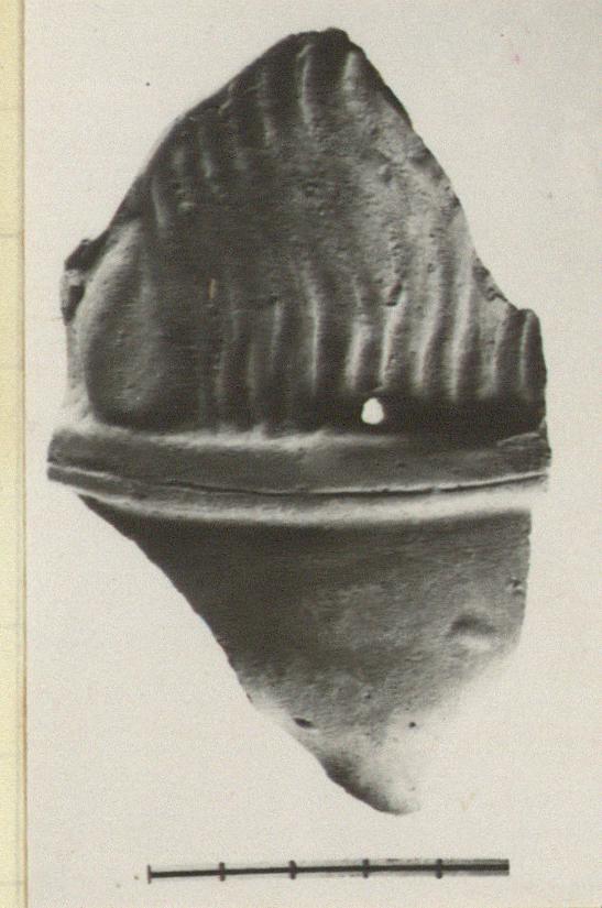 | Description: | Part of nose, forehead, hair and a small horn. The wavy locks of hair rise straight up above a fillet. Pierced at center just above fillet. Sandy buff clay. | |