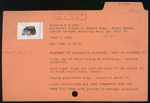 | Description: | Plump leg of child riding on something: scales dolphin (?). Only right thigh and calf and part of the animal (?) on which child rides, remain. Traces of paint (?). Coarse gray-brown clay. ADDENDA Other terracottas and lamp fragments from the same fill kept with pottery in storage container. | |