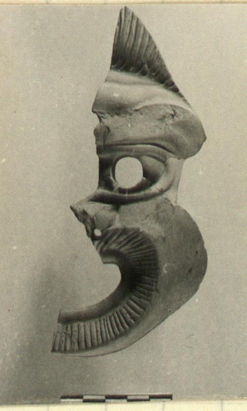 | Description: | Only left side of mouth and nose and lower half of eye preserved. Nostril pierced, iris hollow. Traces of yellow paint (?) beside nose. Buff clay. ADDENDA JWH: A joining fragment from upper half of eye and forehead, added from Θ container 397. | |
