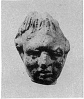 | Description: | Youthful male head, the hair over the brow drawn up into a high top-knot (?). Broken at top and bottom. No trace of color. Buff to pinkish-buff clay. | |