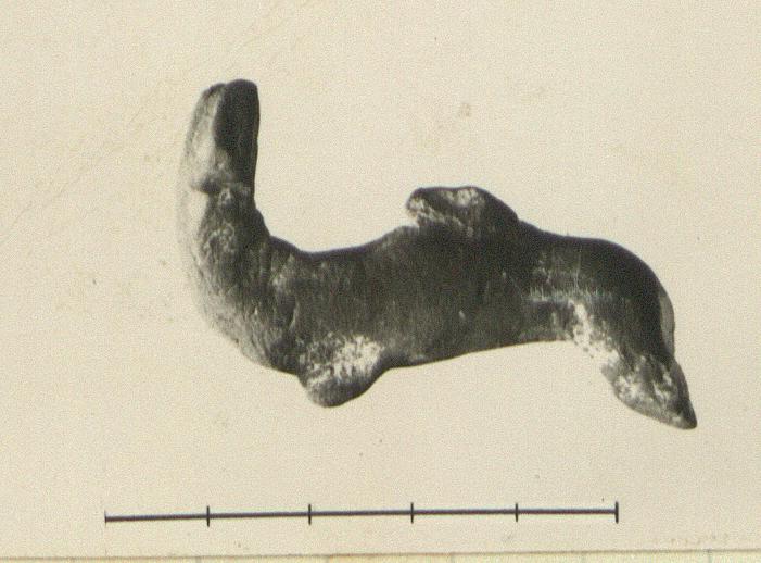 | Description: | Tail and nose chipped. Probably a dolphin (?). Roughly modelled in micaceous red clay. Head turned sharply to side. Traces of white paint (?). | |