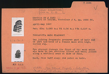| Description: | Two joining fragments preserve part of hair and of left eye-brow of a female mask with high, curled wig. Eye pierced through the front of the mask which was made in two sections (front and back) joined along a vertical seam at side of face. Red paint on hair. Hard, fine buff clay. | |