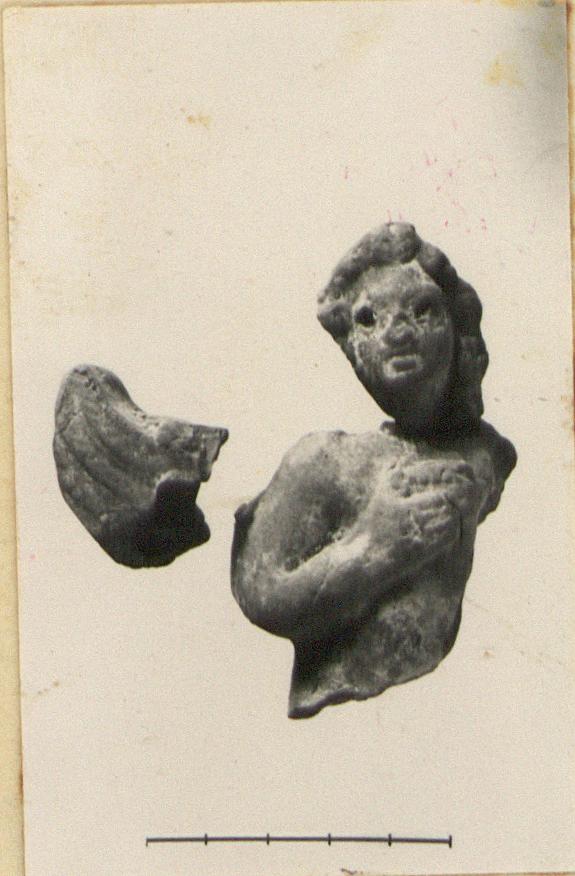 | Description: | Two joined and one non-joining fragment preserve the head, part of torso and tip of right wing. Eros with wings curled up at top, long locks, eyes pierced, holding Pan's pipes in right hand. White paint, covered black over hair and part of body. Hard reddish clay. | |