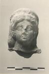 | Description: | Hair parted in center, falling in waves behind ears to shoulders; wreath or headdress; rosette earings. Broken off near base of neck, and behind. Nose chipped. Gray-buff clay; red on face, white on wreath. | |