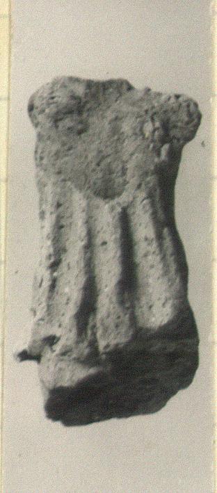 | Description: | Torso only of a draped female figure. She wears a peplos which hangs in long regular folds, girded across the back only. At shoulders, indication of scale pattern, perhaps aegis (?). Hole at neck for insertion of head. Surface broken away at front. Very coarse pinkish clay (tile fabric) with lighter surface. ADDENDA Roman (?). | |