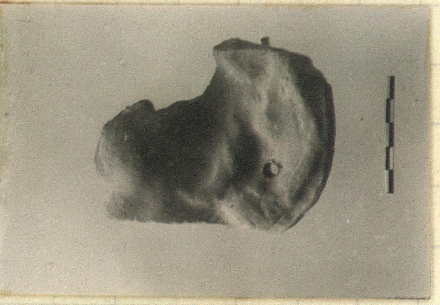 | Description: | Original surface preserved at upper right, and outer corner of eye; otherwise broken all around. Pierced for suspension. Sketchily indicated hair; bulging cheek. Traces of yellow paint. Red clay. | |