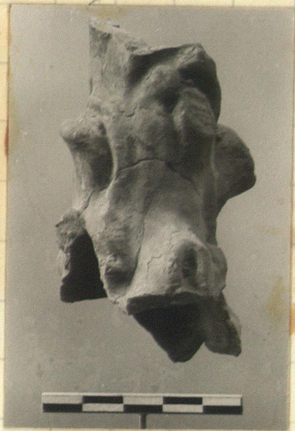 | Description: | Four joining fragments; broken top and bottom. A very knotty tree trunk or club with lead glaze (?). Vitreous yellow glaze much peeled on both inside and outside. Gray clay. | |