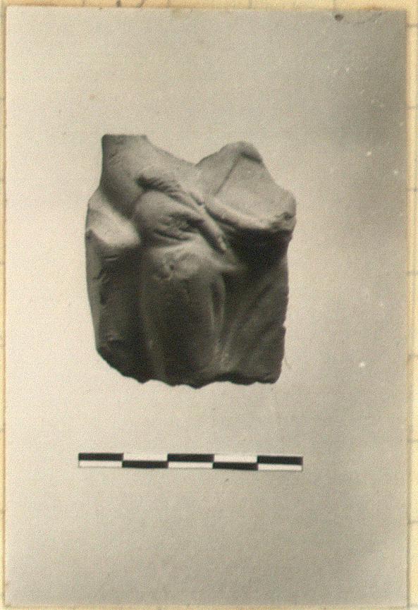 | Description: | Part of draped figure seated on a throne, holding tablet in left hand and a large stylus in right. Matrona with tablet and stylus. Broken all around. Reddish-buff clay. | |