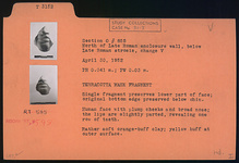 | Description: | Single fragment preserves lower part of face; original bottom edge preserved below chin. Human face with plump cheeks and broad nose; the lips are slightly parted, revealing one row of teeth. Rather soft orange-buff clay; yellow-buff at outer surface. | |