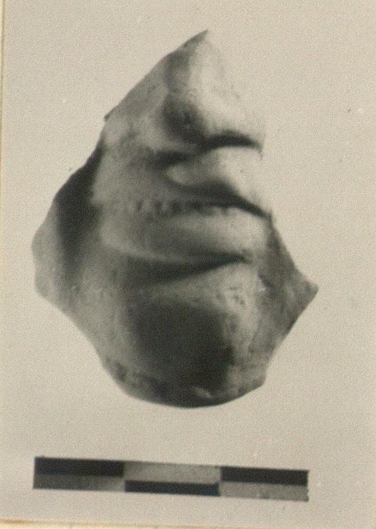 | Description: | Single fragment preserves lower part of face; original bottom edge preserved below chin. Human face with plump cheeks and broad nose; the lips are slightly parted, revealing one row of teeth. Rather soft orange-buff clay; yellow-buff at outer surface. | |
