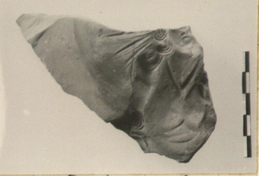 | Description: | Apparently for a medallion or plaque with a flat surface. Part of face and upper body of draped female figure, facing; her rair elaborately dressed in locks which fall to her shoulder. In the field behind her head, rays; at right below, the top of some object (volute krater?) Broken all around. Clean, hard, orange-red clay. | |